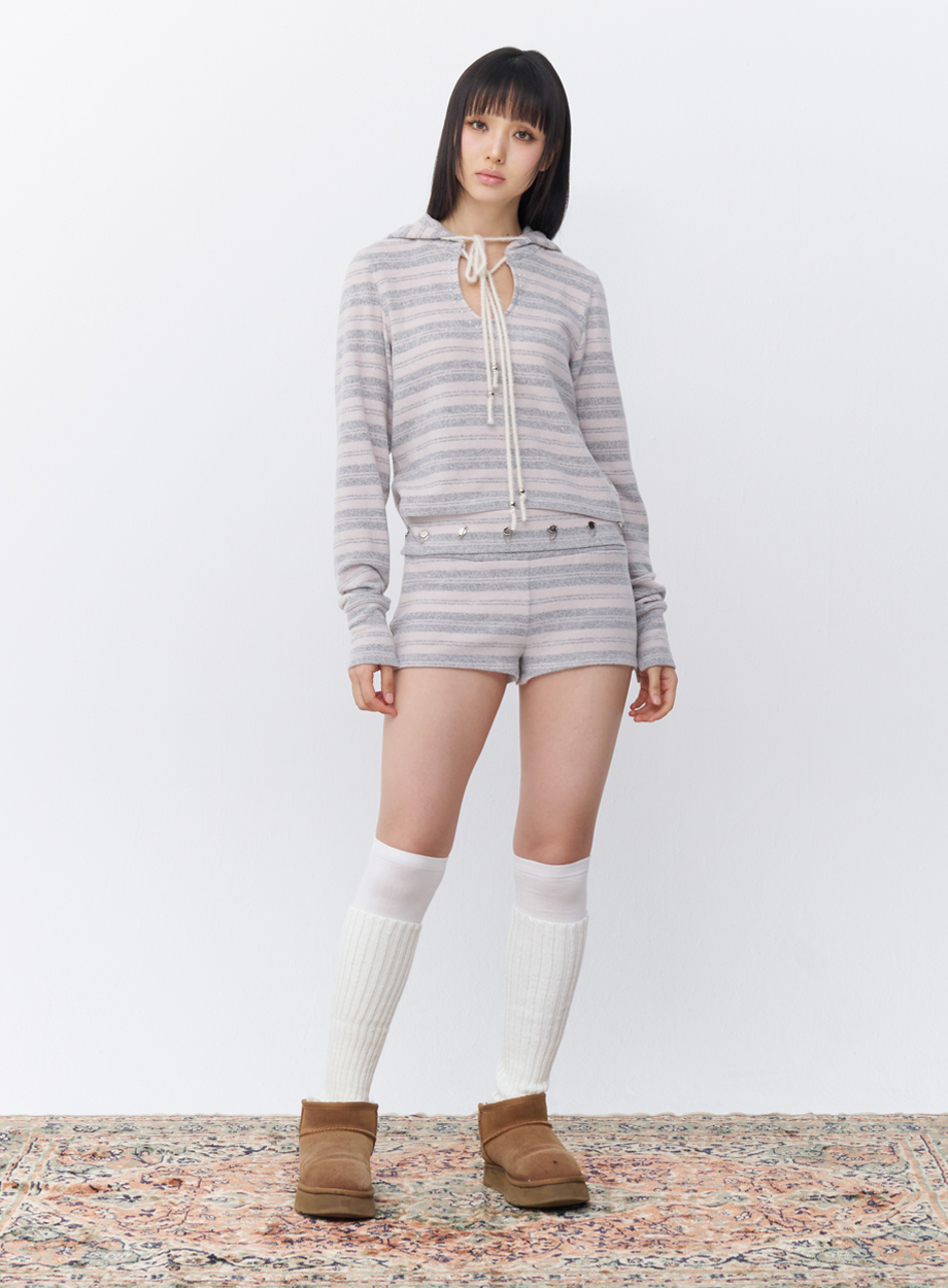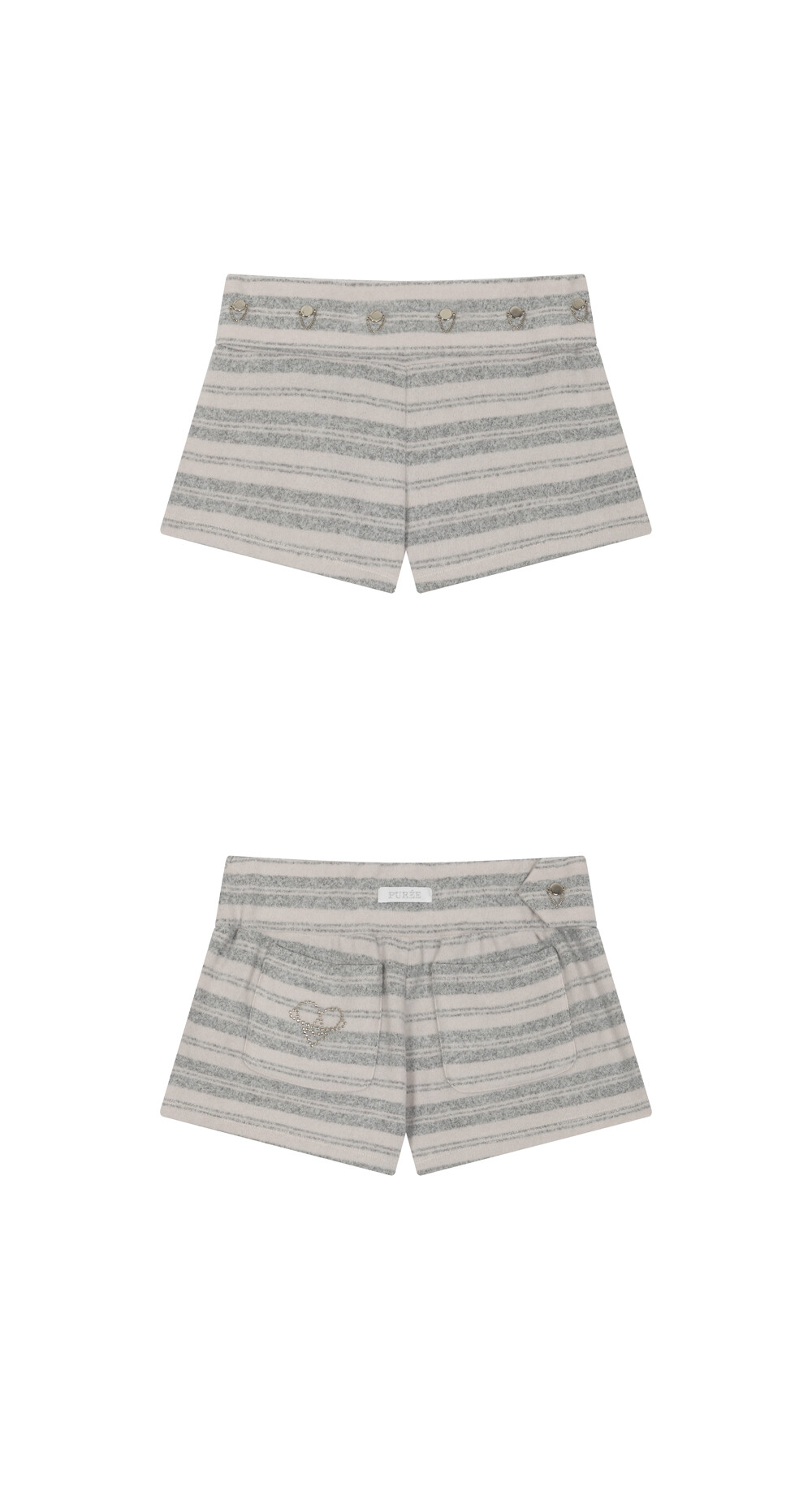 Stretch polyester, rayon blended knit shorts Press-chain stud fastening at front waist band (size adjustable) Pockets at back Stud logo heat-pressed at left-back pocket Elasticized waistband at back