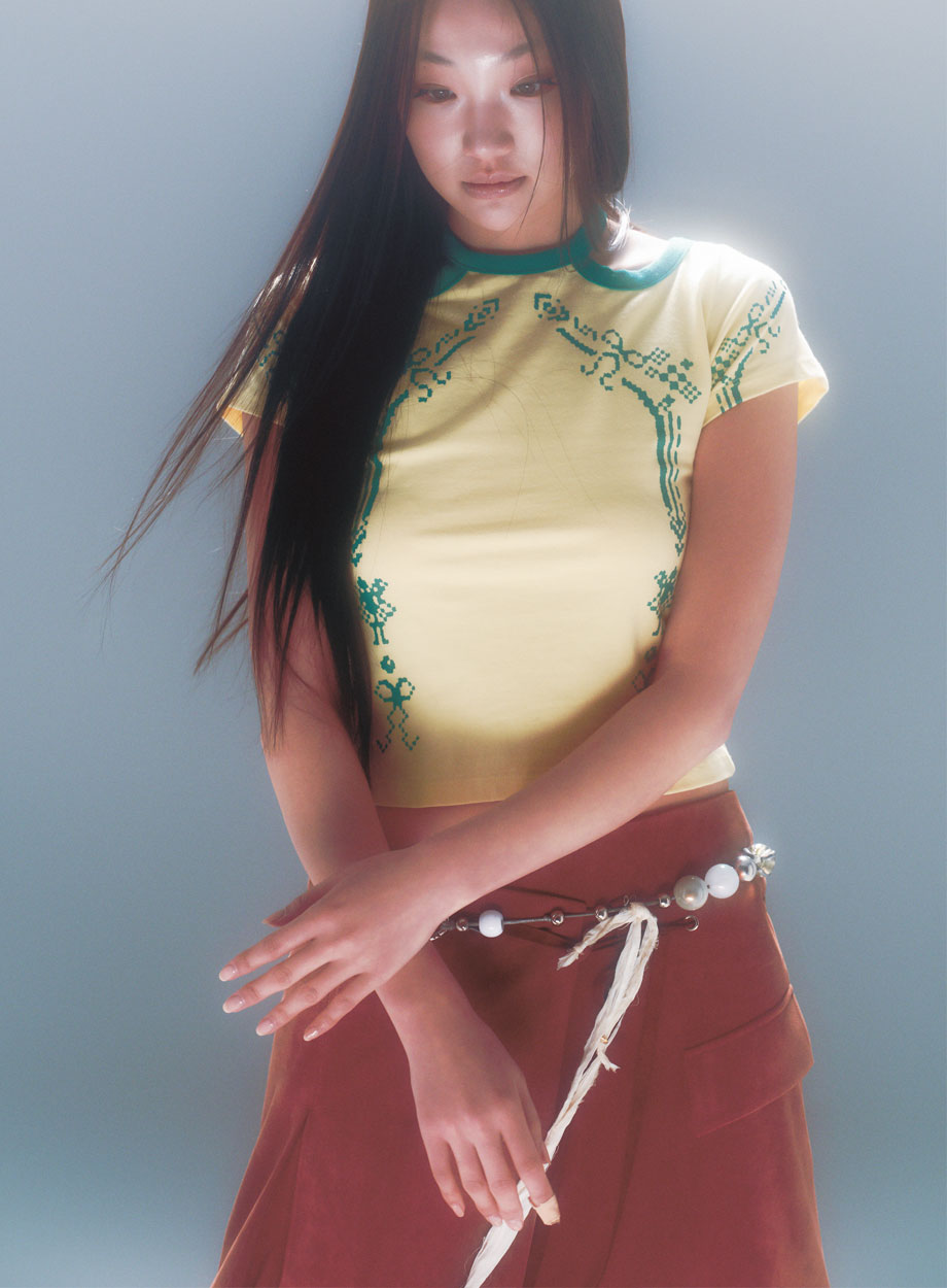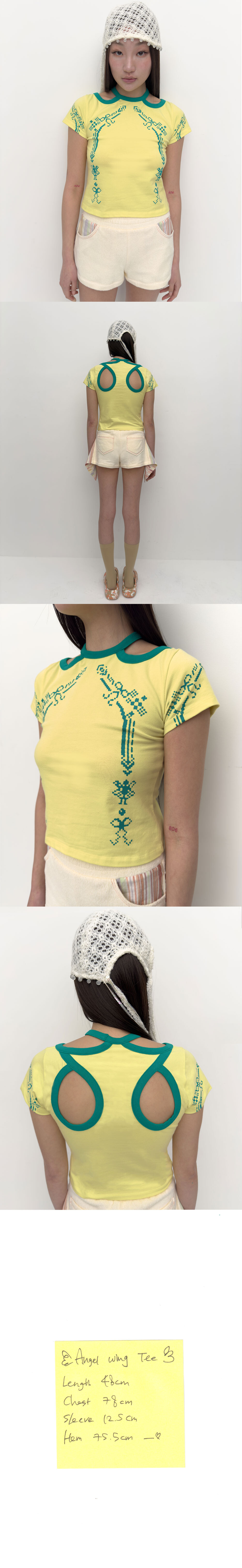 Stretch cotton jersey baby tee Semi-crop length Slim-fit Cut-out at neck, shoulders and back Contrast graphic print at front and sleeves Contrast rib-knit hem One size