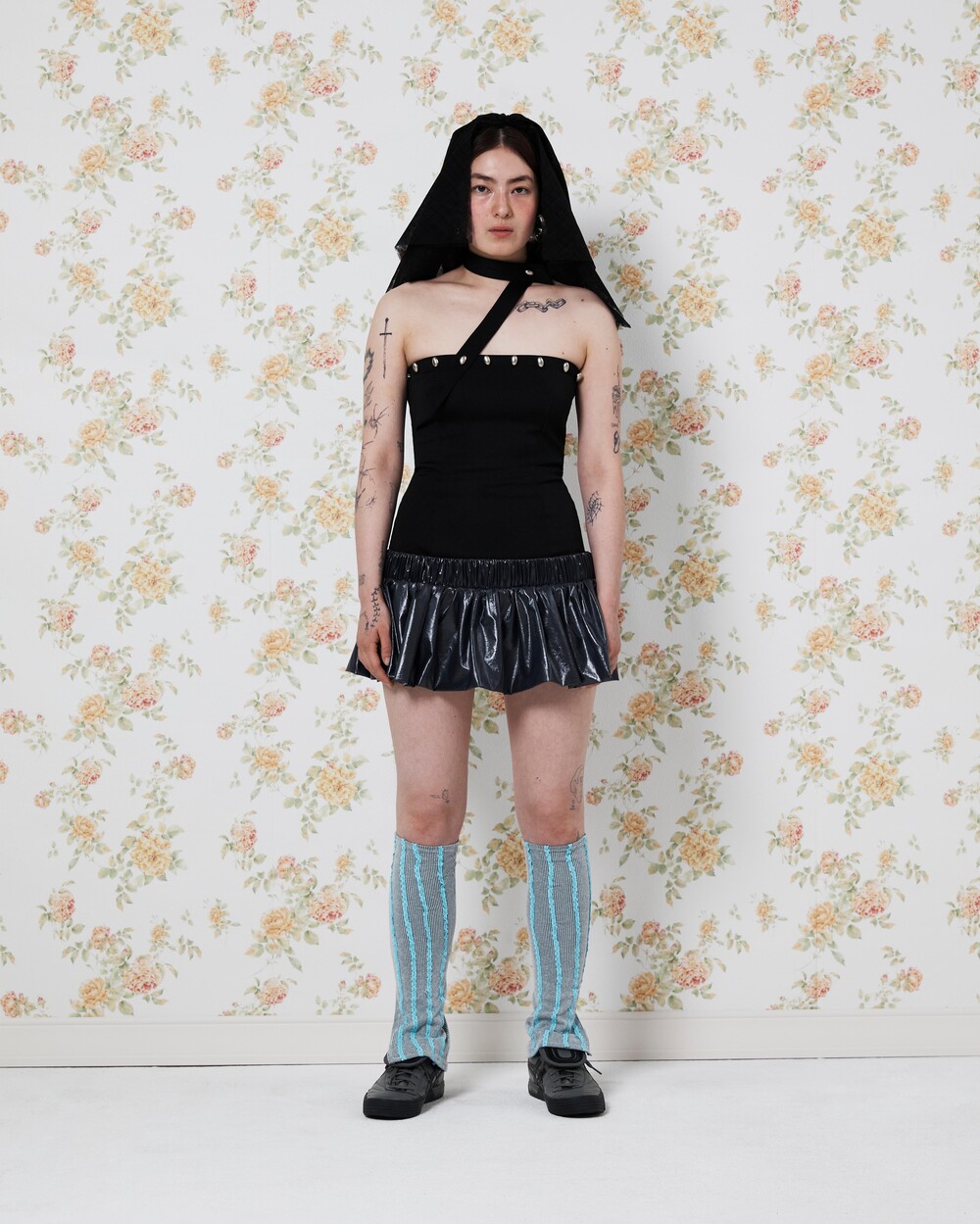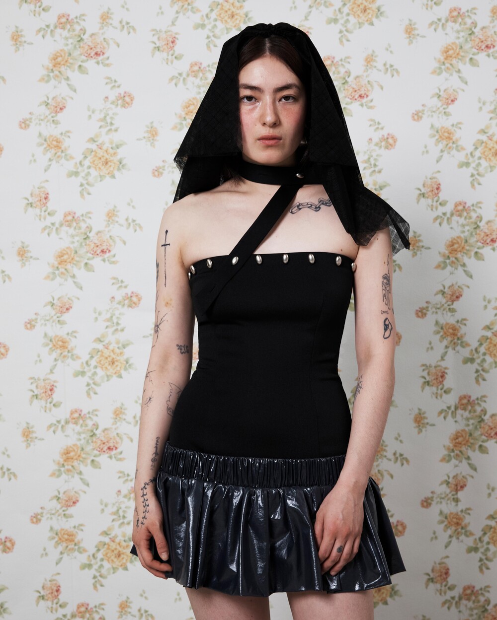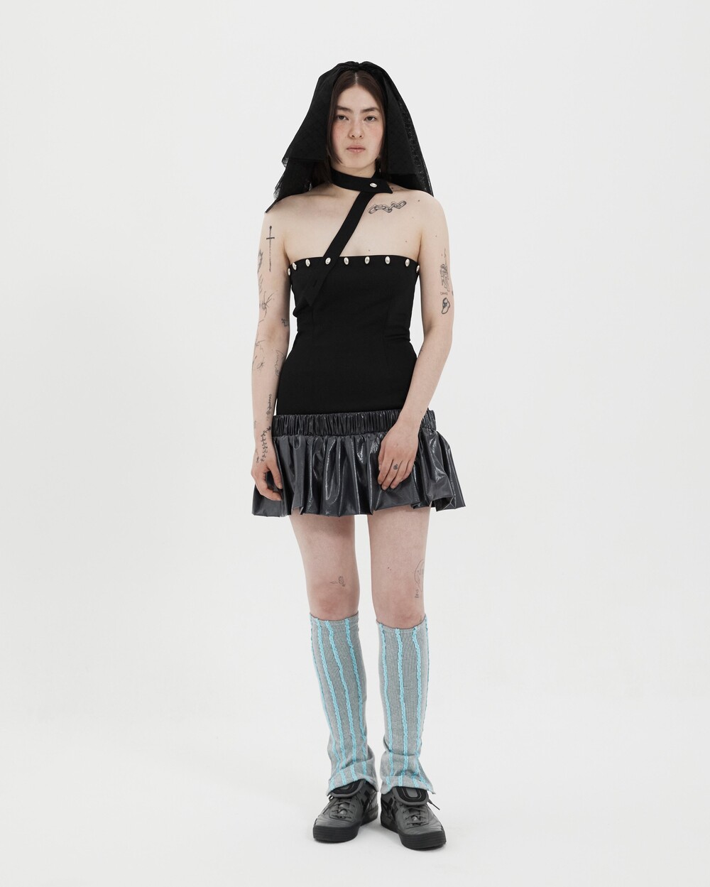 Stretch polyester/cotton-blend dress Balloon-style skirt layered at low-waist Buttons at front Could be styled in many ways by using the strap (Halter-neck, scarf etc.) Zip closure at back One size