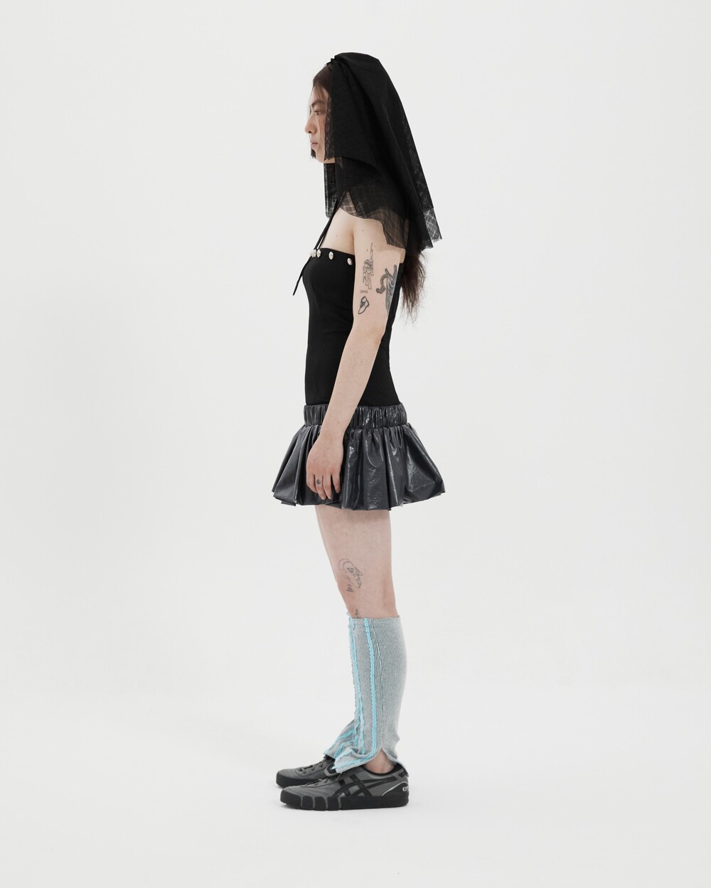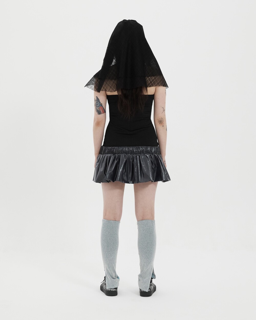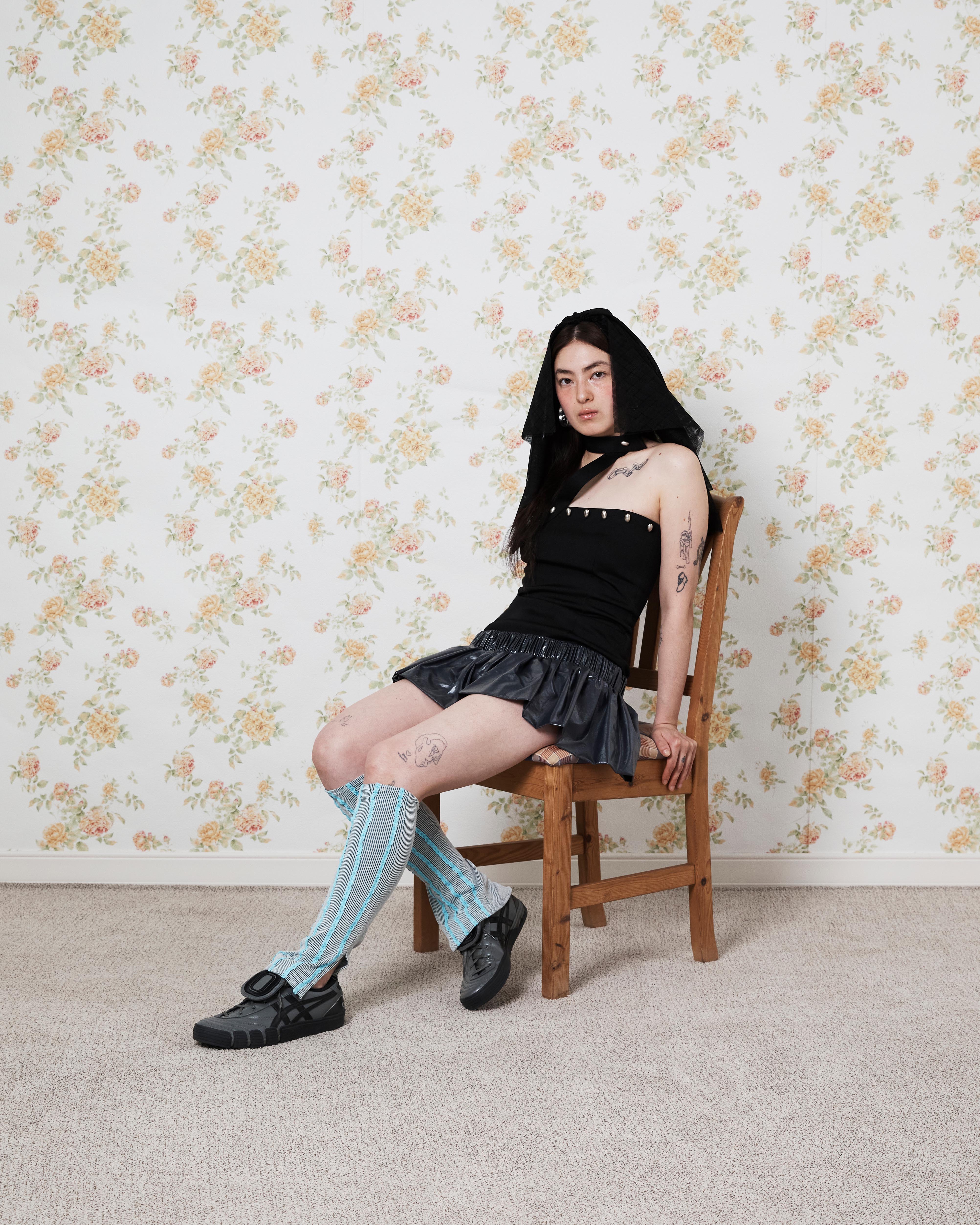 Stretch polyester/cotton-blend dress Balloon-style skirt layered at low-waist Buttons at front Could be styled in many ways by using the strap (Halter-neck, scarf etc.) Zip closure at back One size