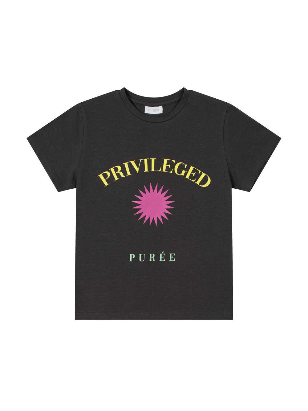Crew neck short sleeved tee Stretch cotton jersey Comes under the waistline Upbeat graphic printed at front Slim fit S size M size