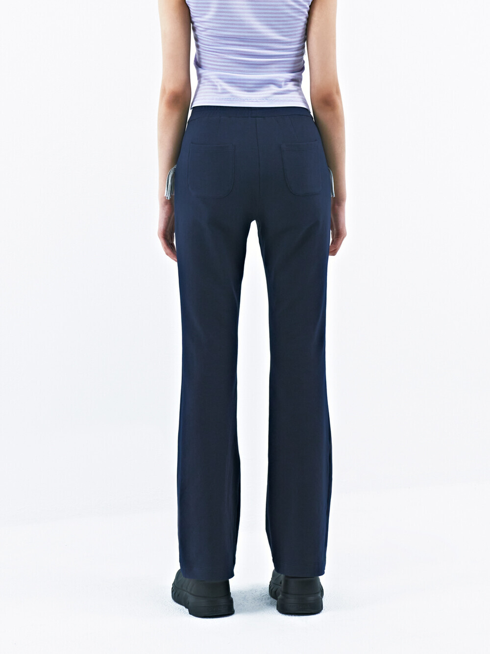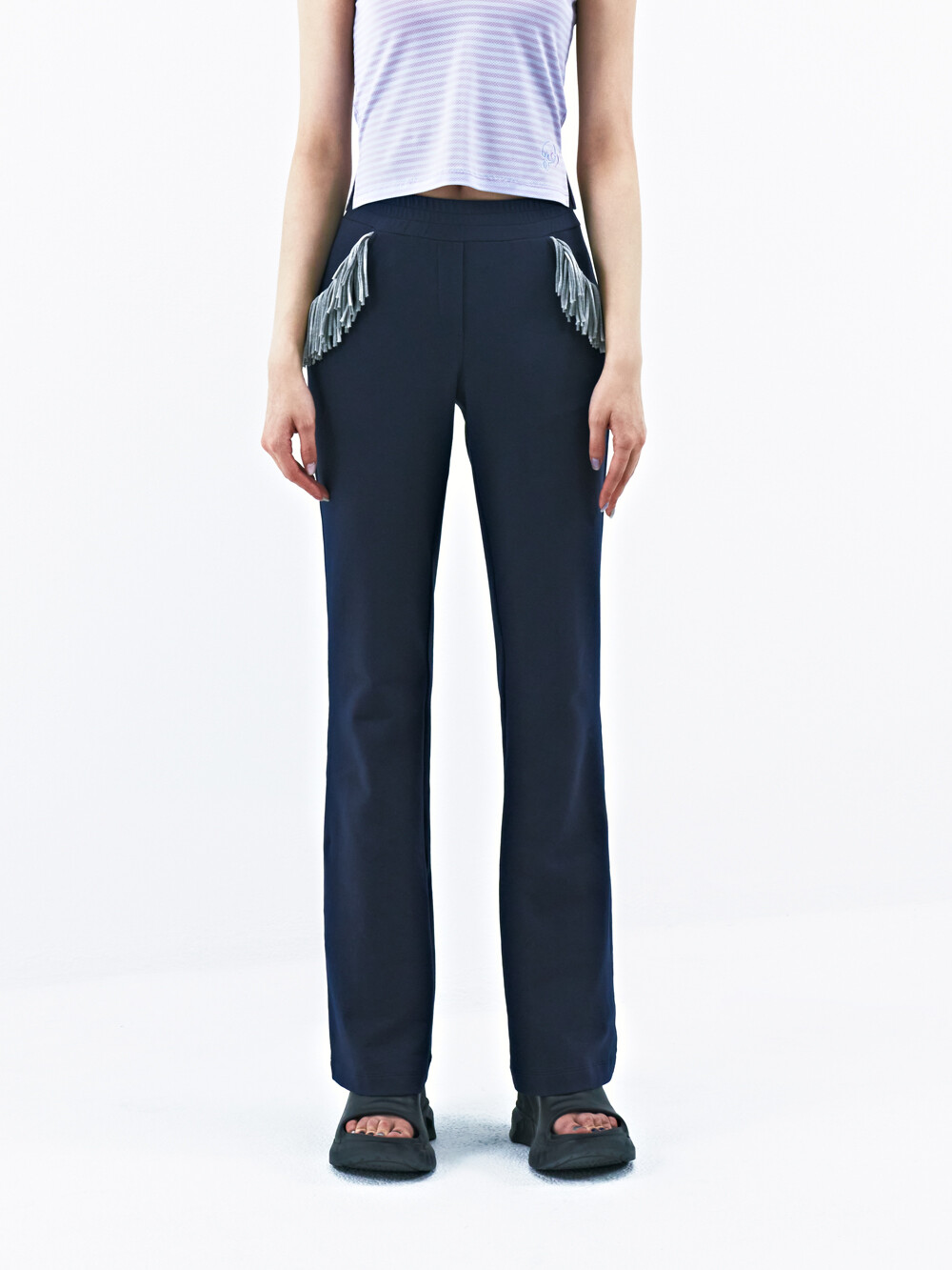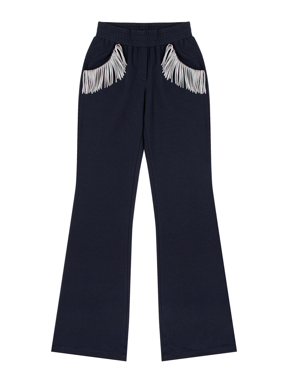 Stretch cotton-blend lounge pants Flare slim fit Fringe trimmed at front pocket line Pockets at back