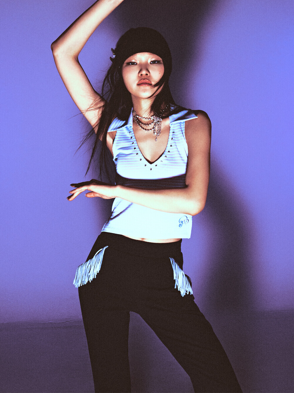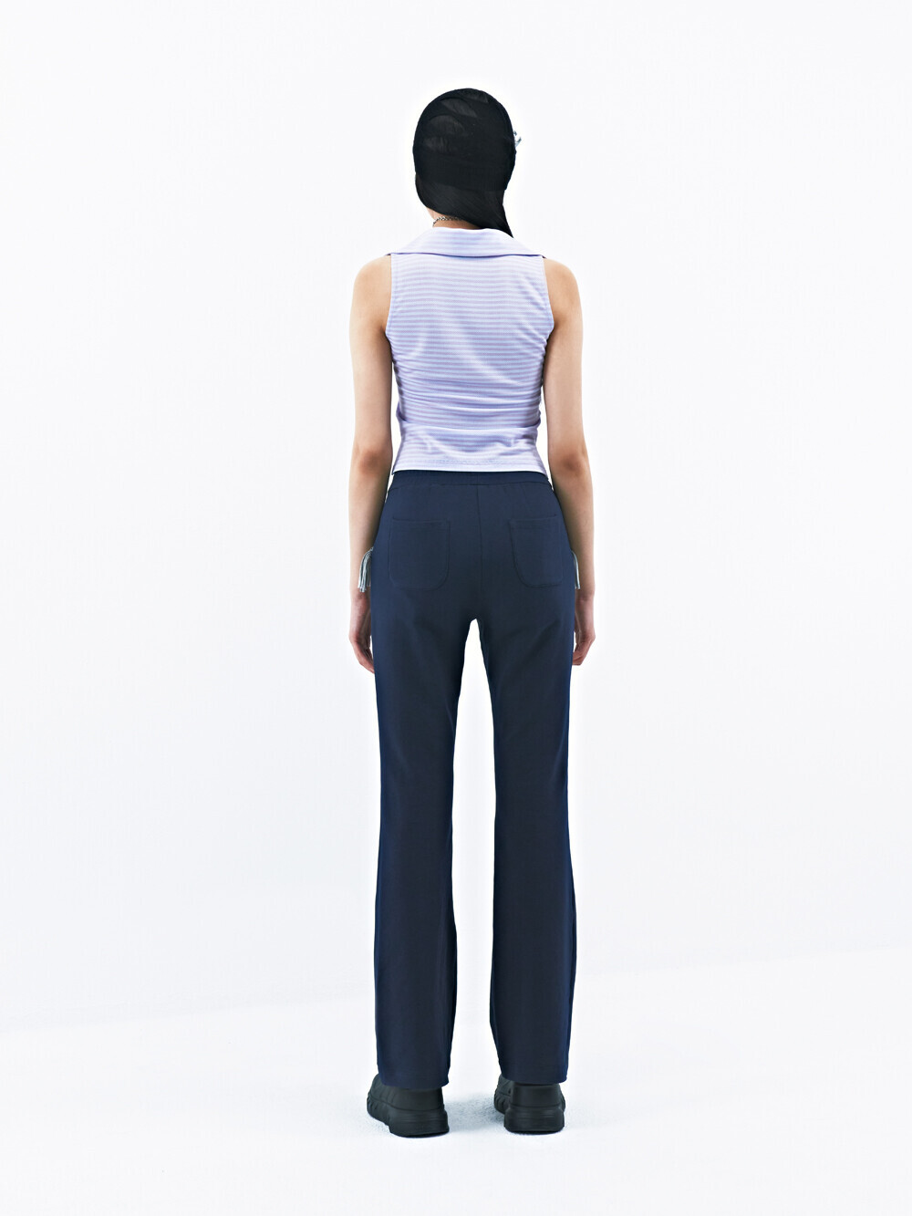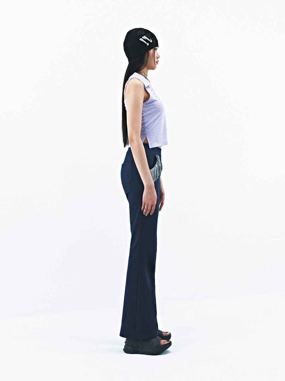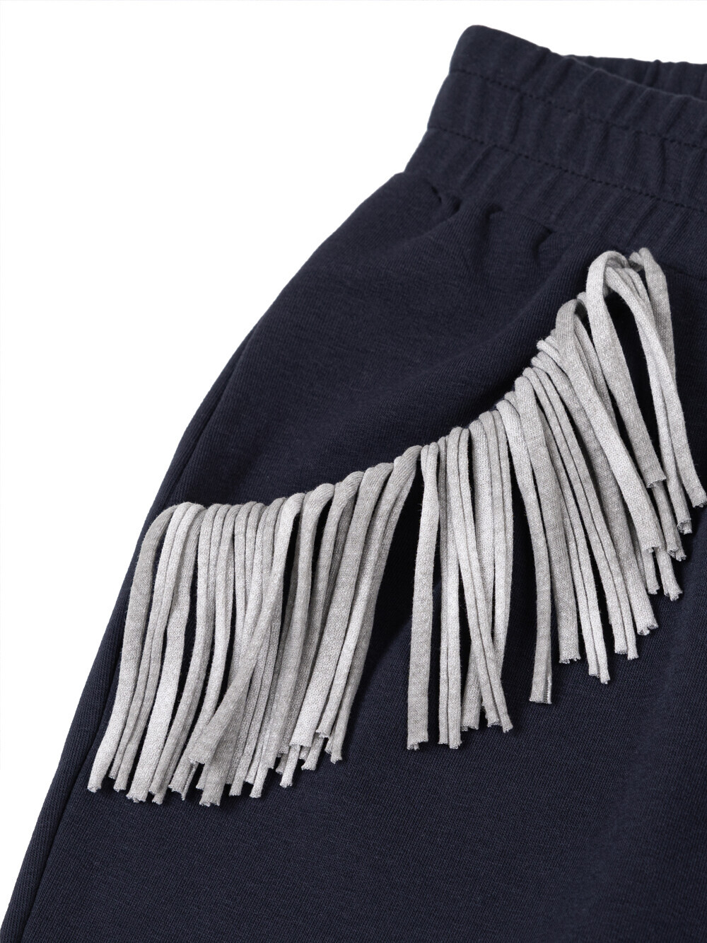 Stretch cotton-blend lounge pants Flare slim fit Fringe trimmed at front pocket line Pockets at back