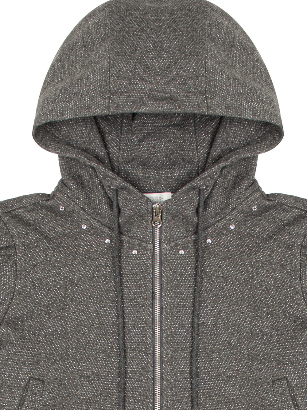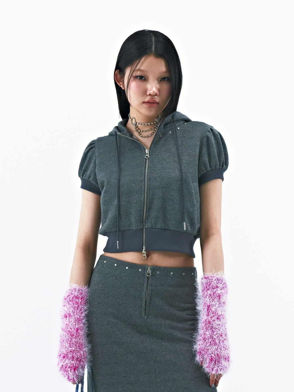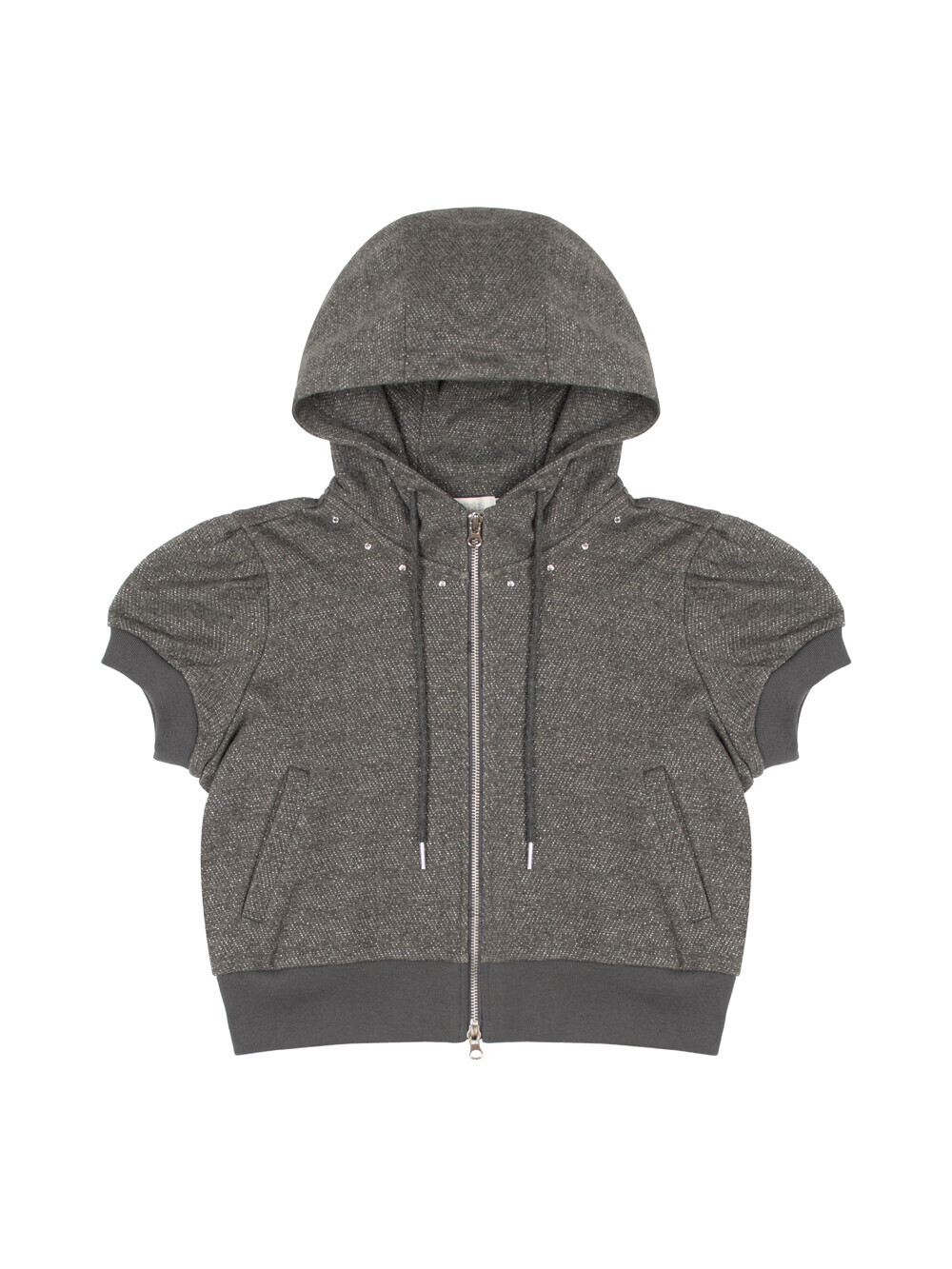 Cotton/metallic-blend jersey Puffed short sleeves Semi-crop length Rhinestones at neckline Two-way zip closure Slim fit