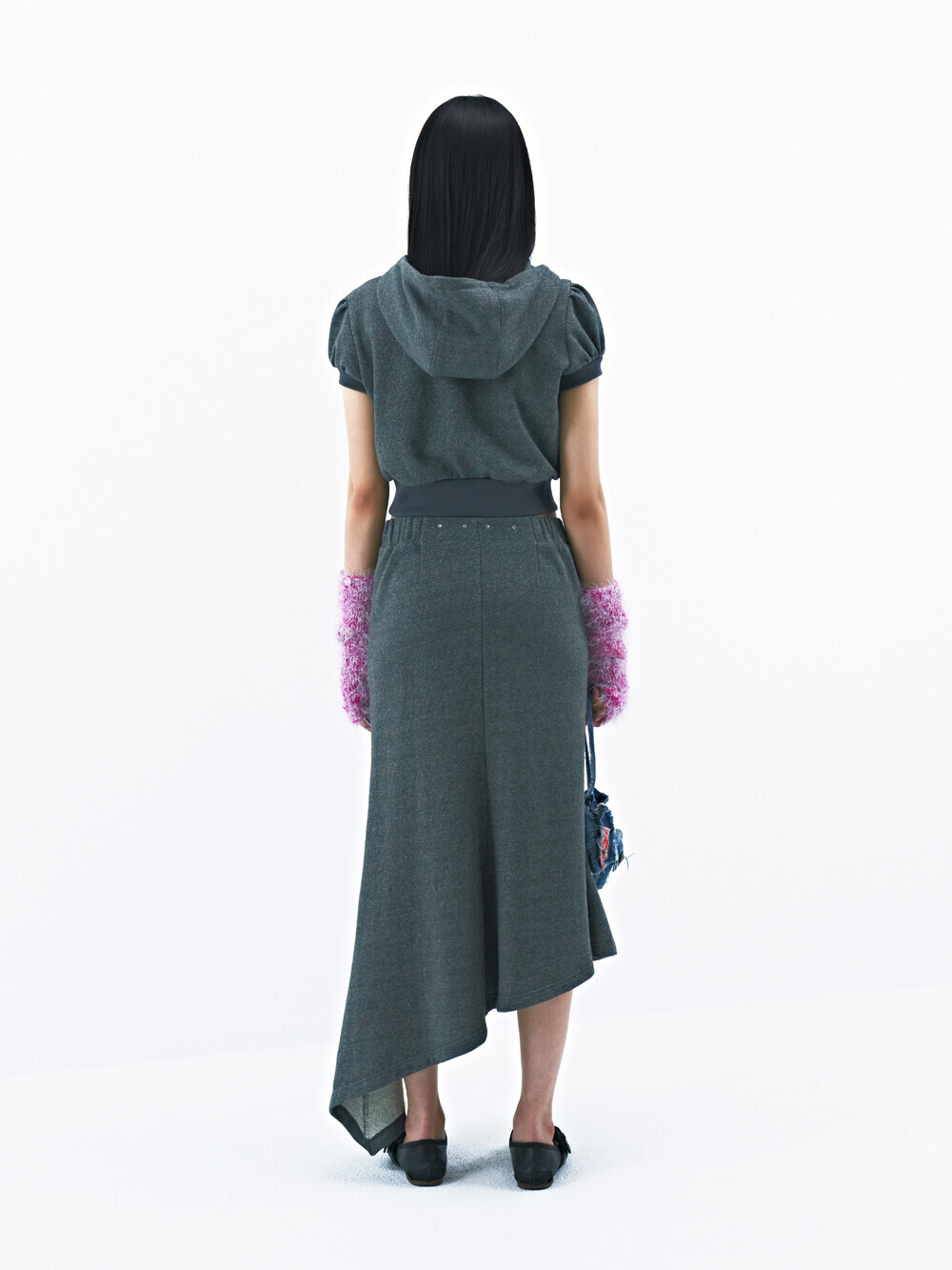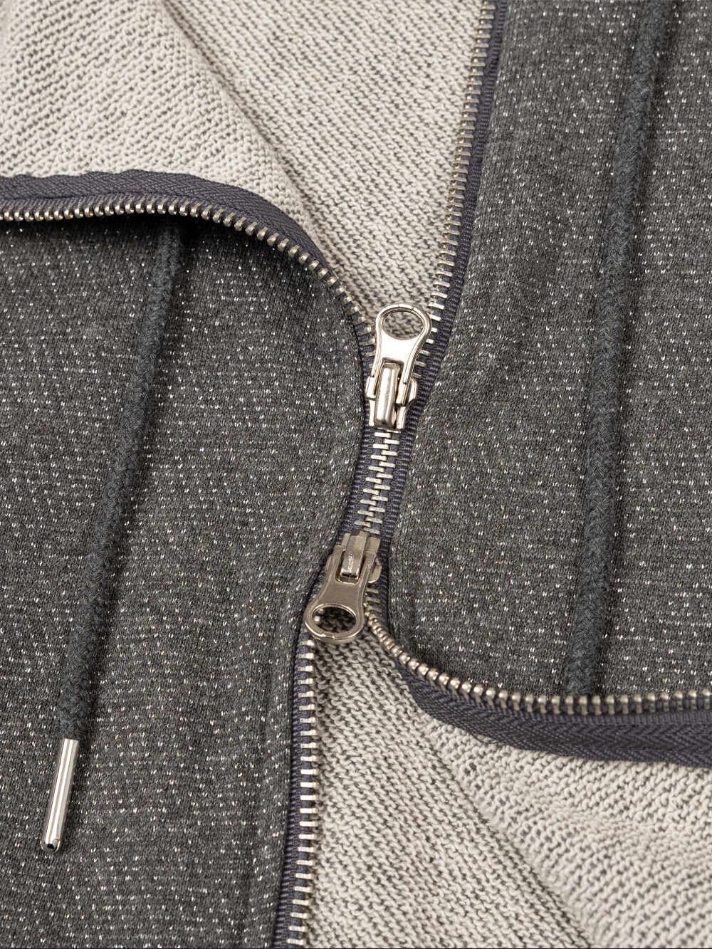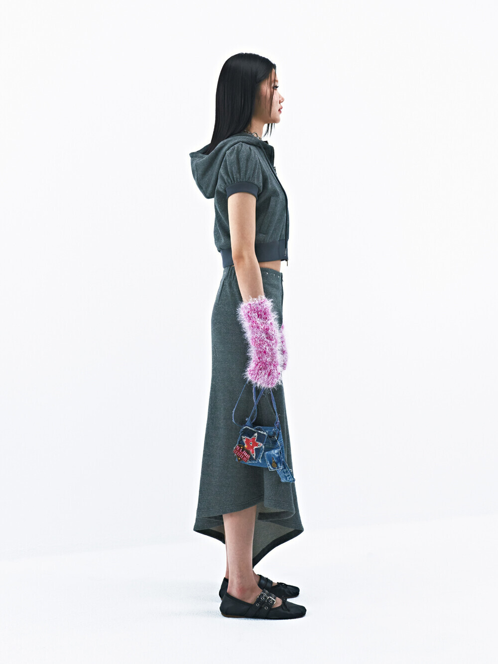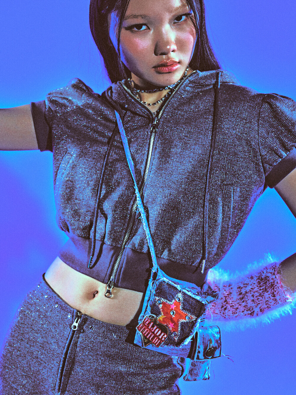 Cotton/metallic-blend jersey Puffed short sleeves Semi-crop length Rhinestones at neckline Two-way zip closure Slim fit